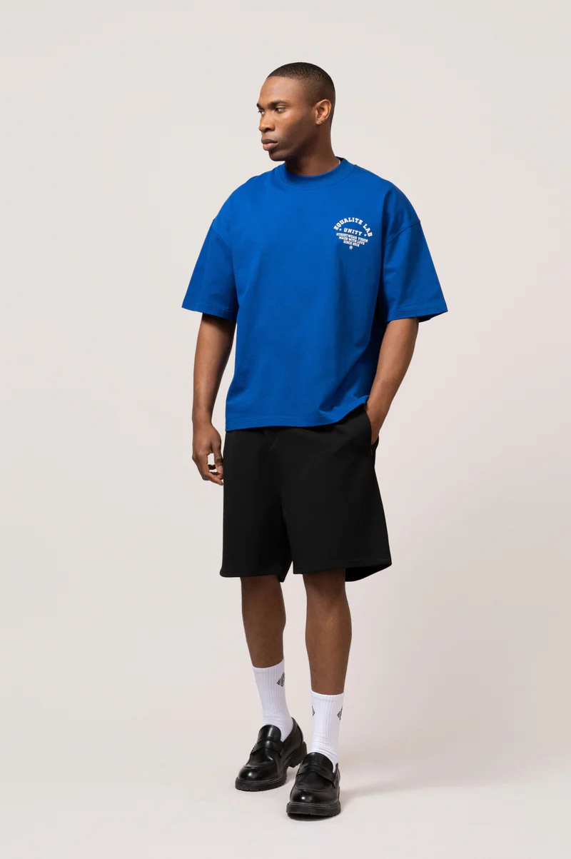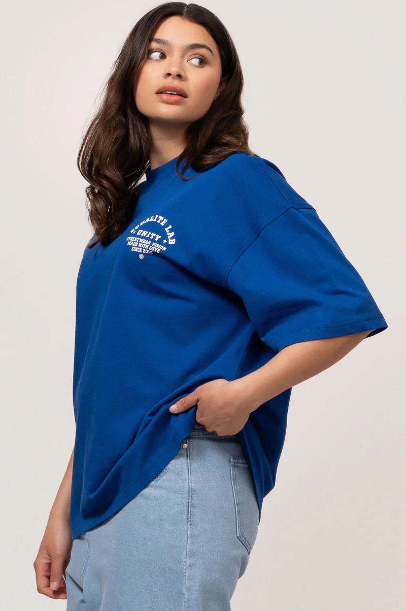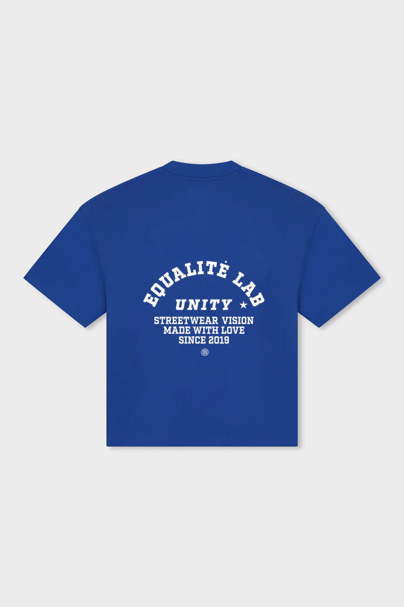 Maak kennis met de Equalité Lucius boxy tee in Blauw. De tee heeft een boxy fit met een ronde kraag en is voorzien van een witte zeefdruk van het "Unity" artwork op de linkerborst en op de rug.